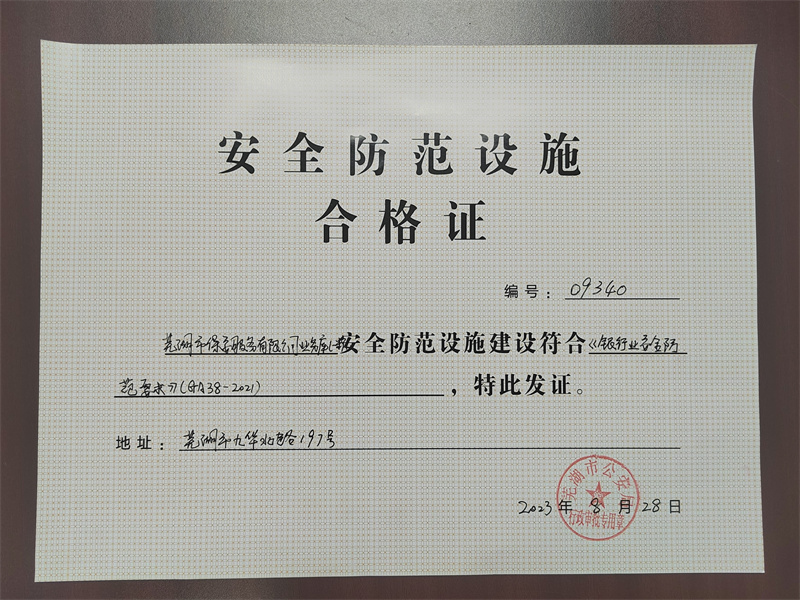 在市公安局业务主管部门的全力支持协调下,经过省公安厅专家组严格的审查验收,日前,安徽省公安厅、芜湖市公安局为市保安公司业务库(金库)颁发了《安全防范设施合格证》,业务库(金库)项目通过省级验收,标志着市保安公司力足主业发展、谋划多种经营,迈出了坚实一步。